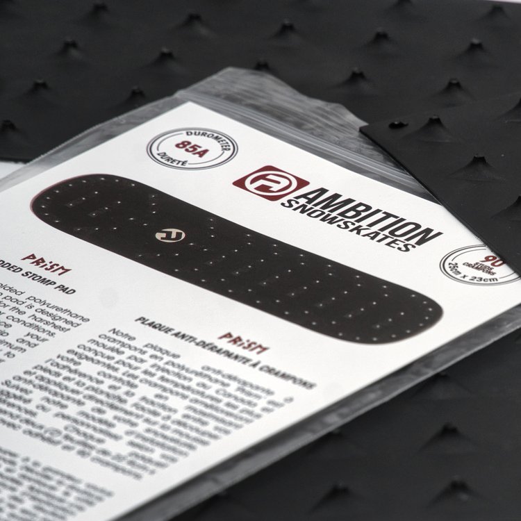 Our injection molded polyurethane studded ‘Prism’ stomp pad is designed and made in Canada by Harfang Solutions for the harshest environments and weather conditions. The studs will enhance your snowskating with added grip and traction under your feet for maximum control and trick consistency. Easy to cut and stick directly onto your snowskate’s foam grip. Follow our recommeded setup or get creative and customize to your own riding style. Each pad includes two (2) 5in x 9in sheets with adhesive backing for a total of 90 studs.
